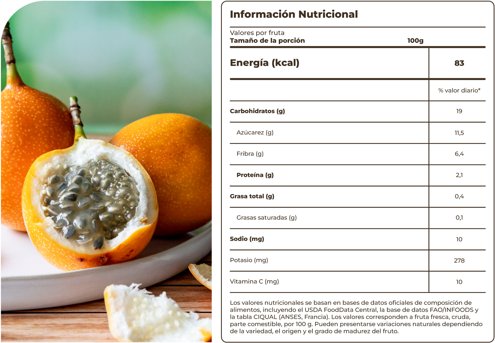 La Granadilla contiene potasio, calcio, fosforo y hierro. Además, contiene proteínas saludables y carbohidratos. Provee vitaminas esenciales para el cuerpo como vitaminas A, B1, B2, B3, B9, C, E, K y provitamina A. Sus semillas son una buena fuente de fibra.